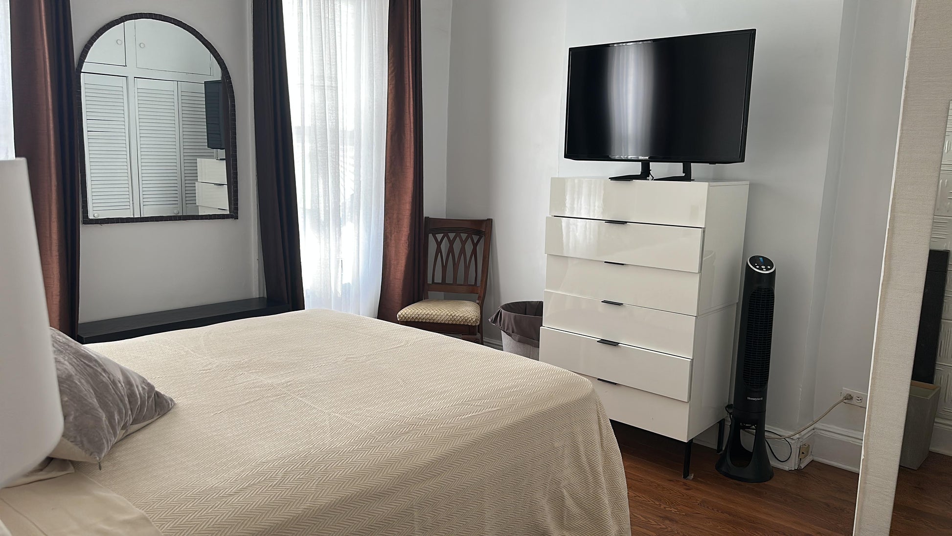 TV, Closet, Heating, Air Conditioning, Queen Bed, Dresser, and Private Entrance